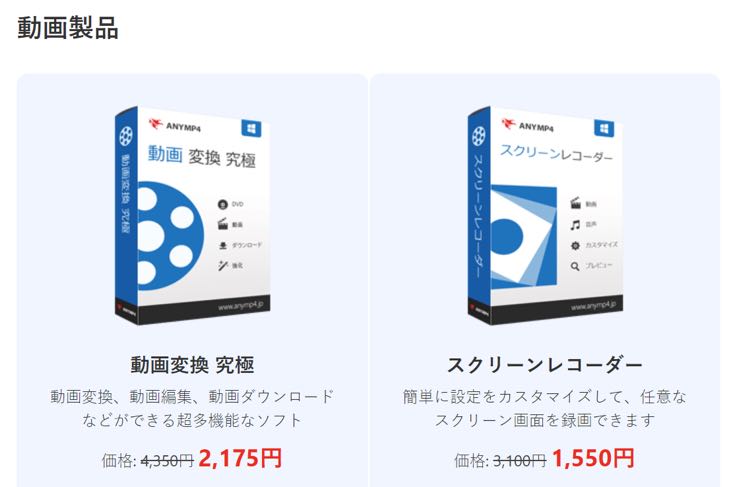 | AnyMP4 動画変換 究極 | 動画、音声ファイルを自由に変換&編集 | 4,350円 | 2,175円 | 2,175円 | |