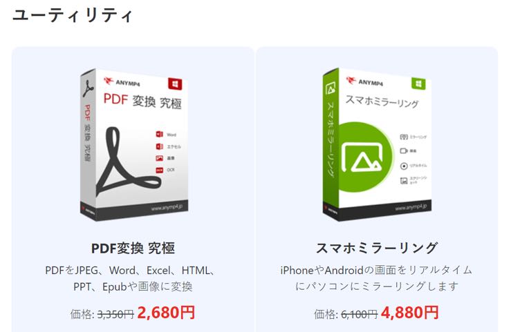 今すぐAnyMP4のユーティリティ製品を購入すると、最大 1,220 円オフになります。下の表をご覧ください。