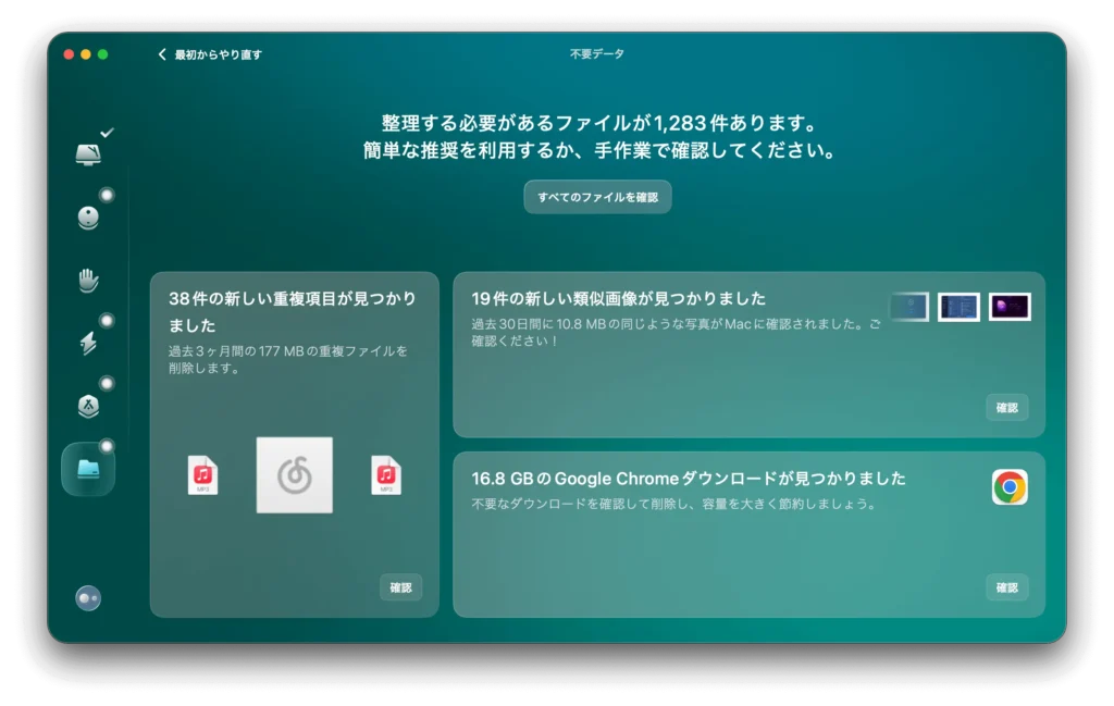 不要なデータという機能も追加しました。重複ファイル、類似ファイル、ダウンロードファイルも選択しながら削除できます。