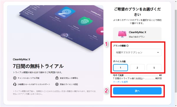 Step 2: ポップアップ画面でプランの種類とデバイスの数を選択し、「次へ」ボタンをクリックしてライセンスを予約します。