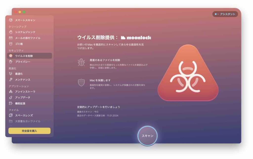 Step 1: CleanMyMac Xを起動してから左側の「セキュリティ」項目で「ウイルスを削除」を選択します。