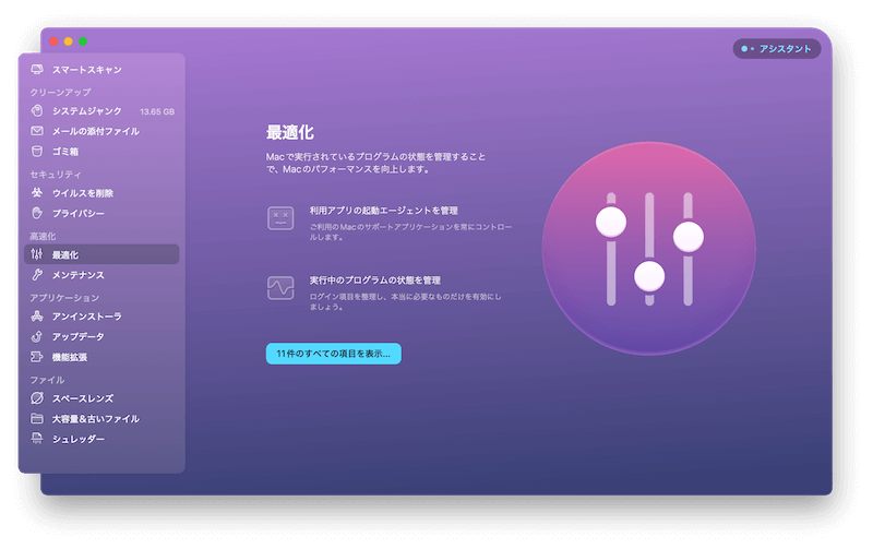 最適化機能を利用すれば、CleanMyMac Xは自動的にログイン項目、起動エージェント、フリーズしたアプリ、リソース消費の多いアプリをまとめて表示されます。自分の必要によっていらない項目を終了してMacを高速化させます。そのほか、メンテナンス機能でMacの定期的な最適化を設定することで、システムへの負荷を軽減できます。