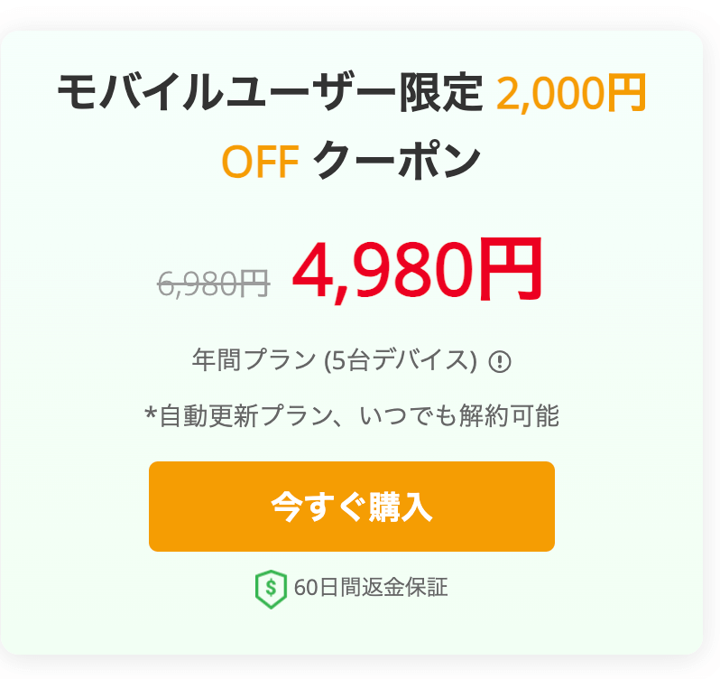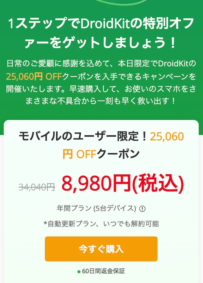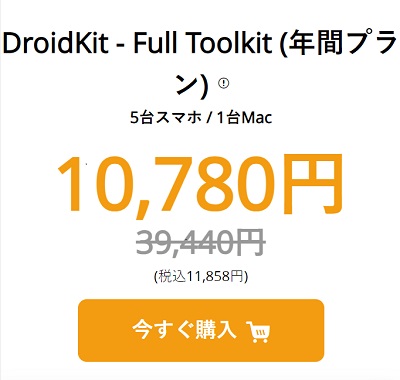 DroidKitは、モバイルユーザー限定の割引情報を提供しております。今、機能別を購入したい場合は、4,980円だけで年間プランを購入できます。