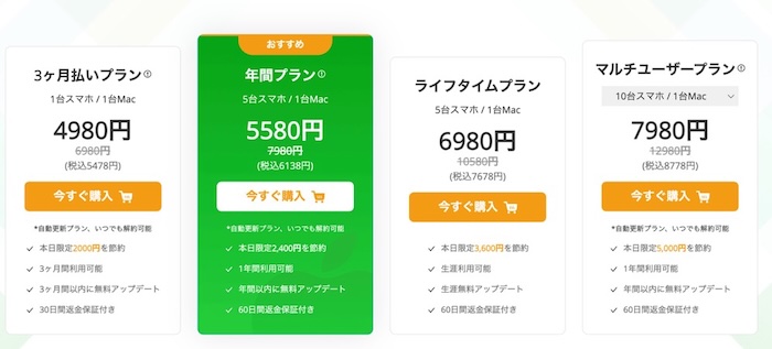 | ライフタイムプラン | 5台スマホ / 1台パソコン | 6,980円 | 10,580円 | 3,600円 |