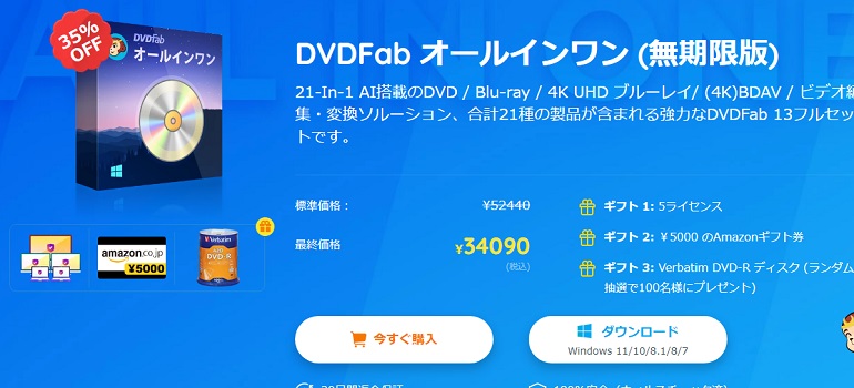 現在もDVDFab オールインワン(無期限版)はセールを行って、原価は52440円で、35%割引した後は34,090円で18350円節約します。DVDFab オールインワン(無期限版)を購入すると同時に3つのプレゼントがもらえる:5ライセンス、5000円のAmazonギフト券とVerbatim DVD-Rディスク(ランダム抽選で100名様にプレゼント)。