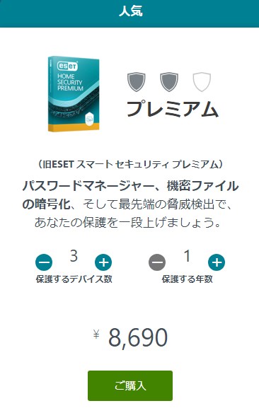 ESET セキュリティソフトプレミアムプランは三つのデバイスを1年間に保護することができます。値段は¥8690だけです。