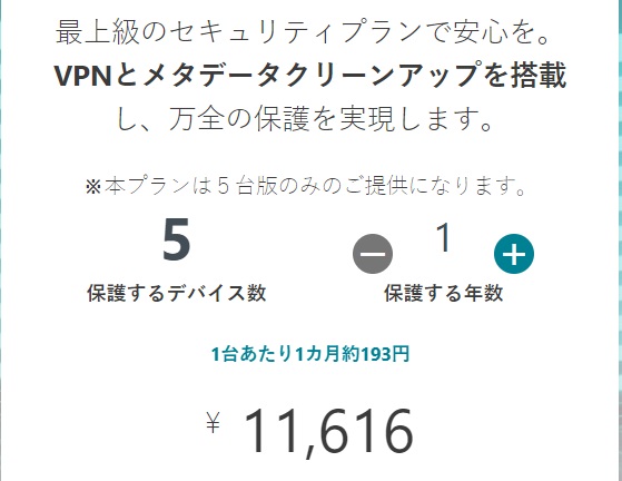 ユーザーは、最大 5 台のデバイスに対して割引価格でESETのアルティメットのセキュリティプランに加入できます。 このプランへの加入費用は 11,616 円、つまり 1 台あたり月額約 193 円となります。 なお、このプランにはメタデータクリーニングと VPN が付属しており、ユーザーに包括的な保護を提供します。