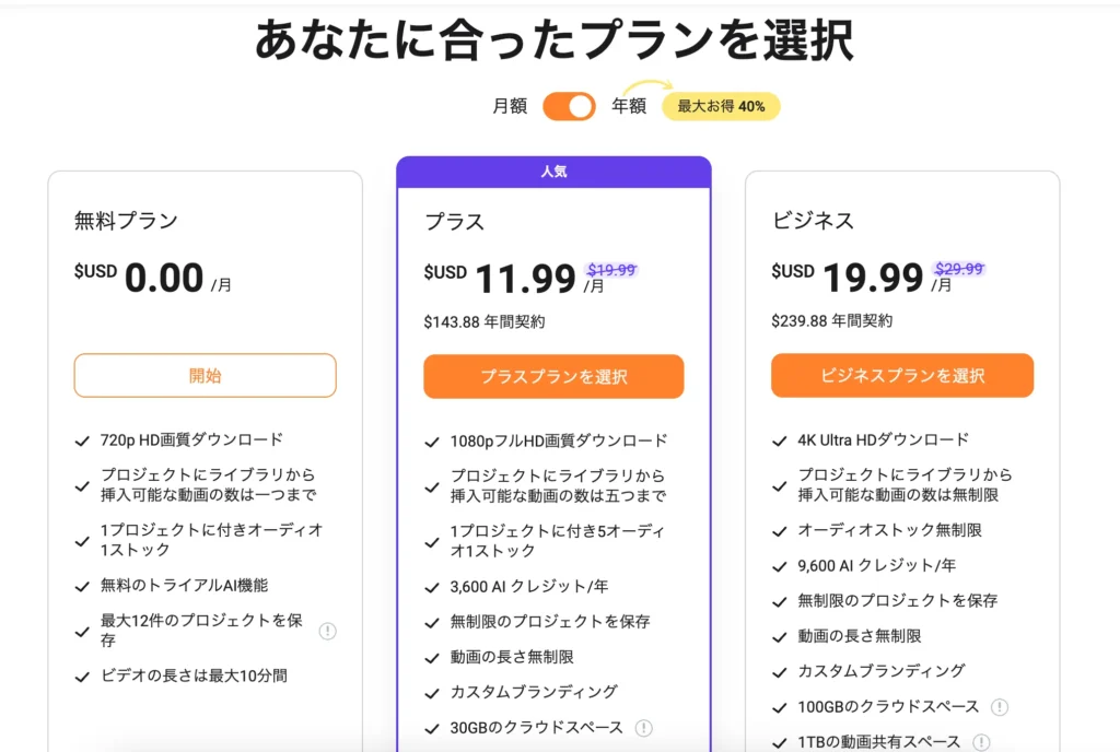 有料版はプラスプランとビジネスプランに分かれています。 プラスプランのすべての機能を使用できますが、ビデオのエクスポート品質は 1080P です。 ビジネスプランにはほとんど制限がなく、ビデオのエクスポート品質は4Kです。