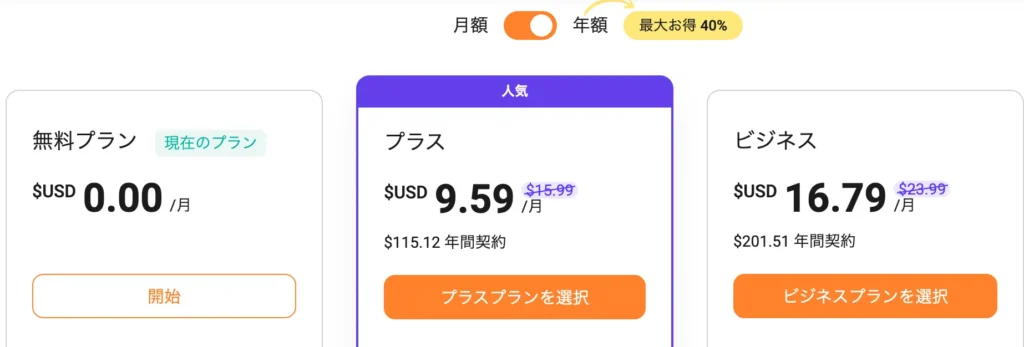 FlexClipに無料登録すると、表示される価格が変わります。通常価格は年額プランで月あたり$19.99ですが、登録後は、$15.999/月となり、40%オフの特別価格($9.59/月)が適用されます。ビジネスプランと同じ、$16.79/月となります。未登録のままより、ずっとお得にご利用いただけます。ぜひこの機会にご登録ください。