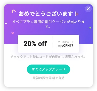 今なら新規会員登録で20%割引クーポンプレゼント! この割引はすべてのプランで利用可能で、クーポン番号はmjqORN17です。