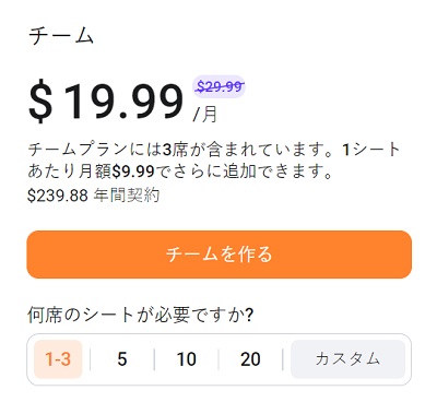1 人から 3 人、 5 人、10 人、20 人まで利用可能なチーム プランがあります。今すぐ購入すると 33% 割引をお楽しみいただけます。 元の価格は 29.99 ドルですが、割引後はわずか 19.99 ドル(3席まで)です。