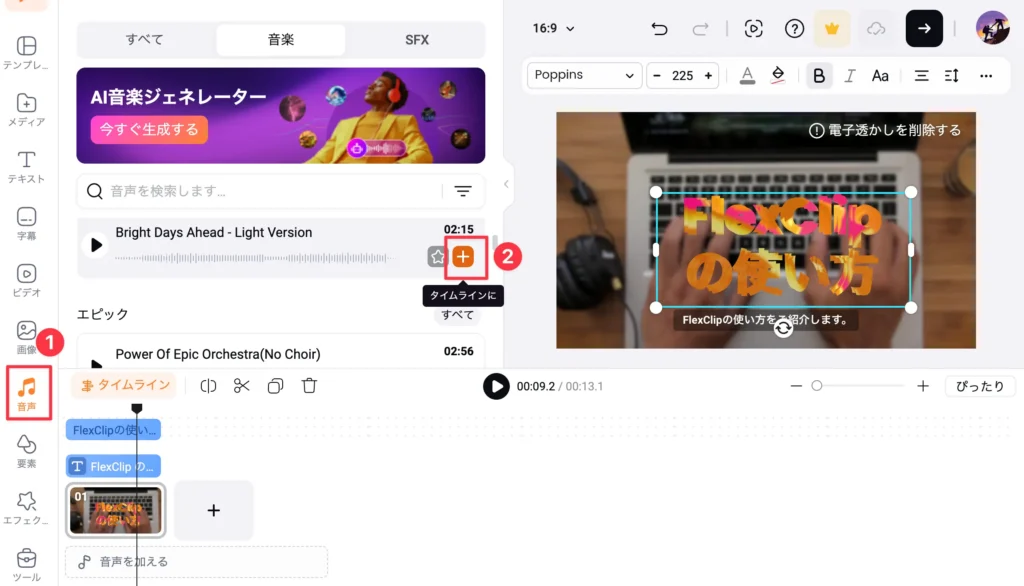 FlexClipには内蔵の音楽ライブラリを用意しており、適当なBGMを追加して、動画の魅力をアップすることができます。