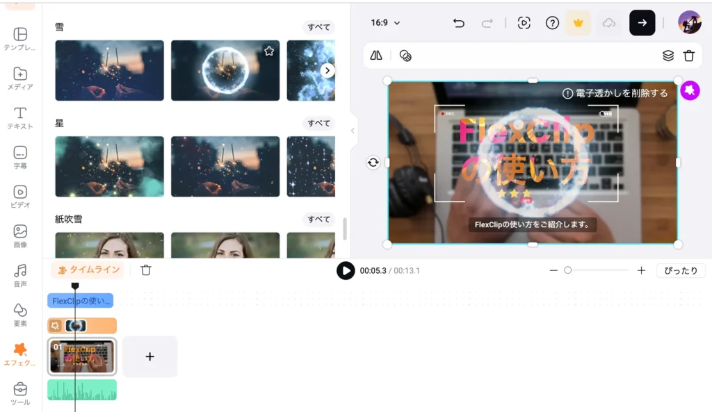 エフェクトとは、視覚的または聴覚的な効果を指します。いつも動画に印象的な加工や演出を加えるために使われます。FlexClipでは、豊富なエフェクトを使って、動画に視覚的な魅力を加えることができます。タイトルや字幕、場面転換などにエフェクトを組み合わせることで、より印象的な動画を簡単に作成可能です。