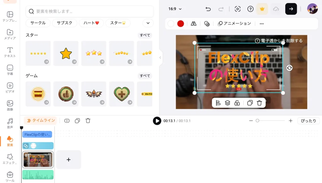 可愛いステッカーや図形・アニメーションも充実しています。FlexClipの無料版では利用できる要素もたくさんあります。今すぐ動画を楽しくデコレーションしましょう。