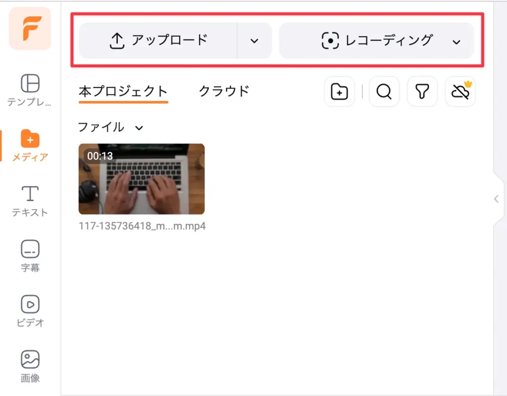 もっと多くのメディアファイルを追加したい場合は、「アップロード」ボタンをクリックしてください。「レコーディング」ボタンをクリックすると、新しい動画ファイルを収録することもできます。