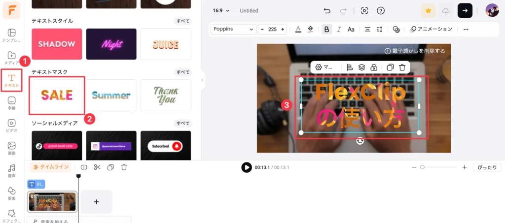 FlexClipのブラウザ版では様々なテキストタイプも追加することができます。まず、左側のメニュー欄から「テキスト」をクリックします。