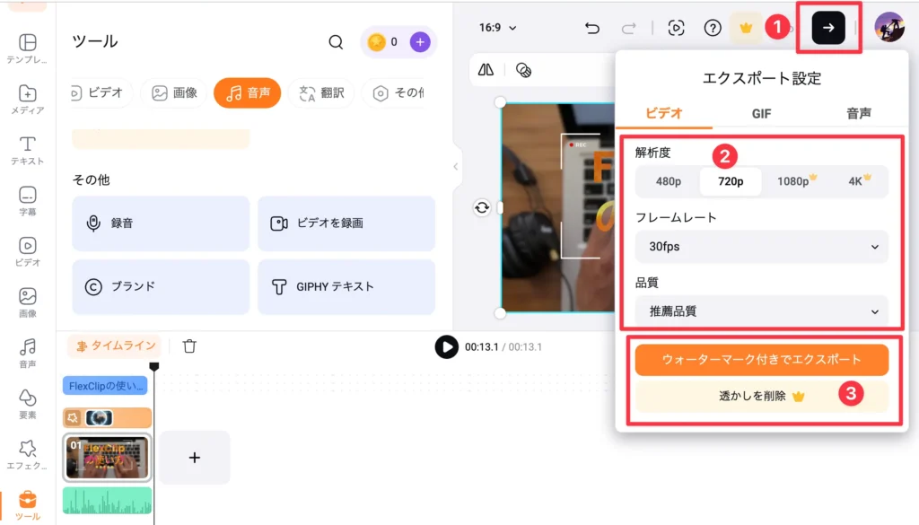 - 無料プランでは動画にFlexClipのロゴ(透かし)が入る