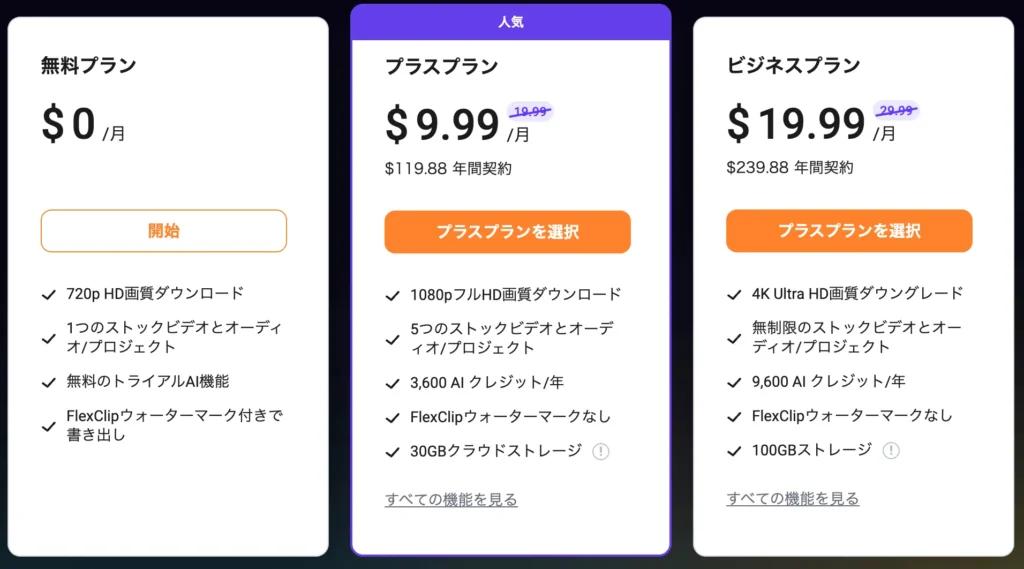FlexClipは無料プランでも基本的な操作は可能ですが、ウォーターマーク付きや画質、動画書き出し長さなどの制限があります。なので、無料で試して、必要に応じてアップグレードするのがオススメです。
