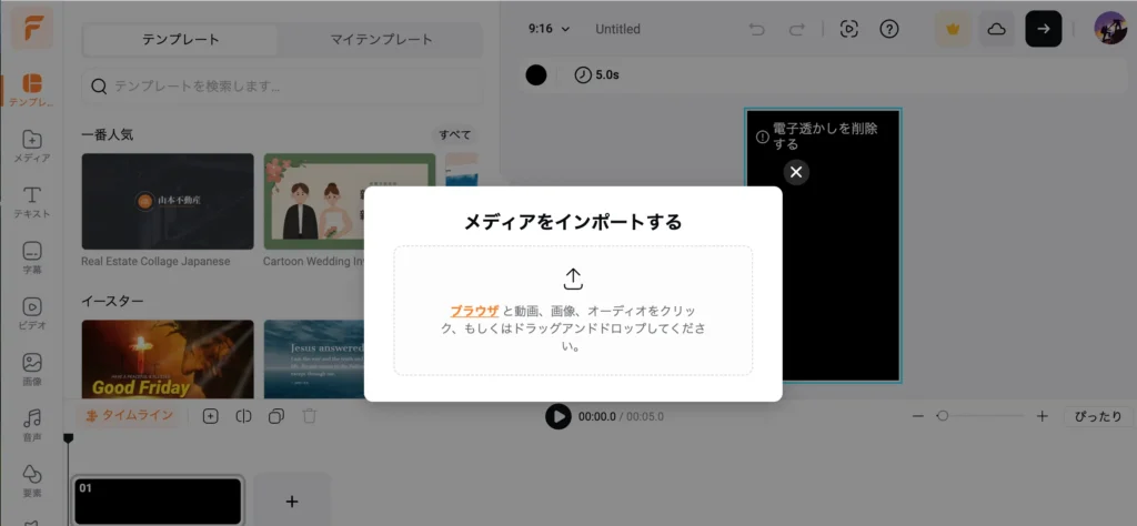メディアをインポートするウィンドウをクリックして、パソコンから動画を選択してアップロードします。