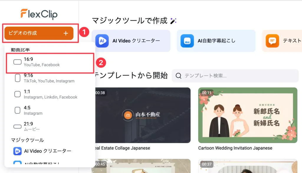 「ビデオを作成」、「マジックツールで作成」、「テンプレートから開始」3つのモードを選択して、FlexClipで動画の作成・編集をスタートします。ここでは、「ビデオを作成」を例にします。