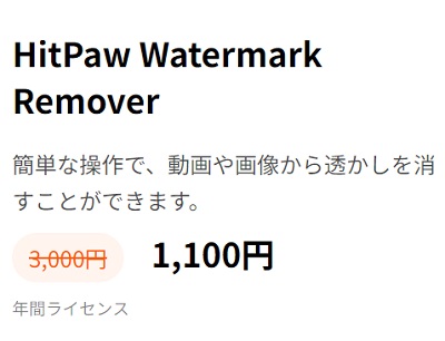 HitPaw Watermark Removerの年間プランを購入すると1,900円の割引を受け、最終的に税込1,100円(通常価格3,000円)で購入できます。 これはHitPaw Watermark Removerが提供する最安値です。