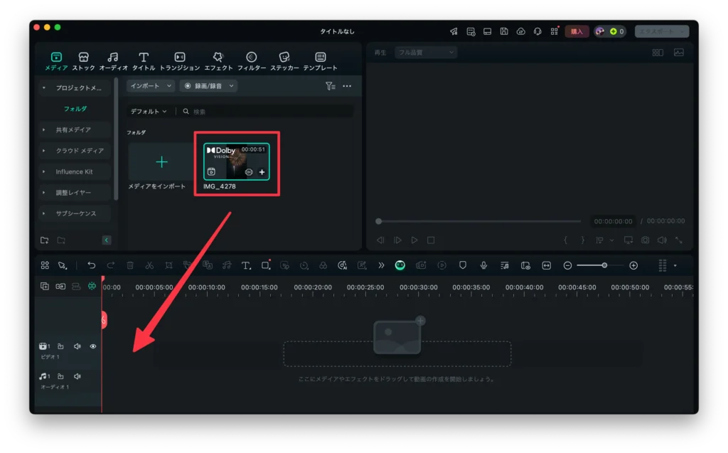 ステップ1. Filmoraを起動し、編集したい動画・画像をインポートしてタイムラインにドラッグ&ドロップします。