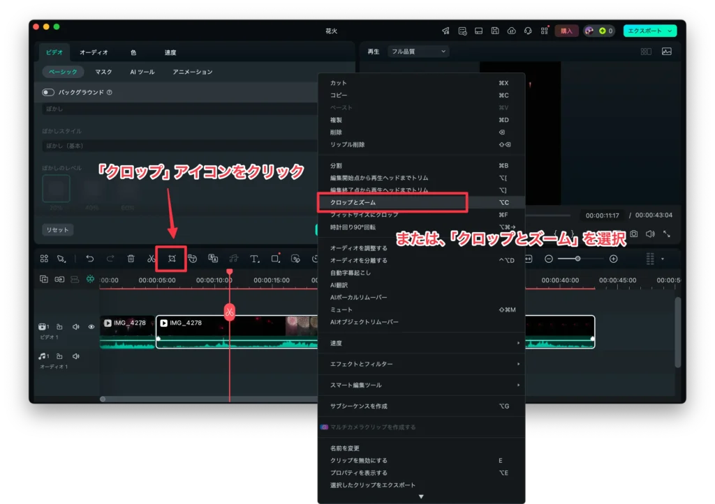 ステップ2. タイムラインでクロップしたい動画や画面を選択して、メニュー欄から「クロップ」を選びます。または右クリックして、「クロップとズーム」を選択します。