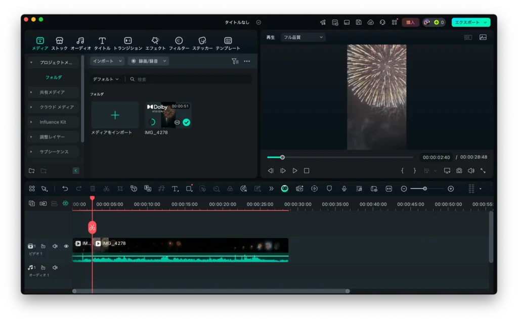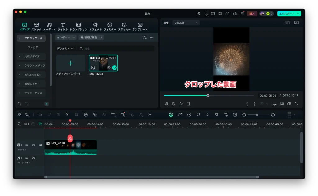 ステップ4. Filmoraでクロップした動画(画像)は以下のように表示されます。このような切り抜きは、見せたい花火を強調するのに役立ちます。