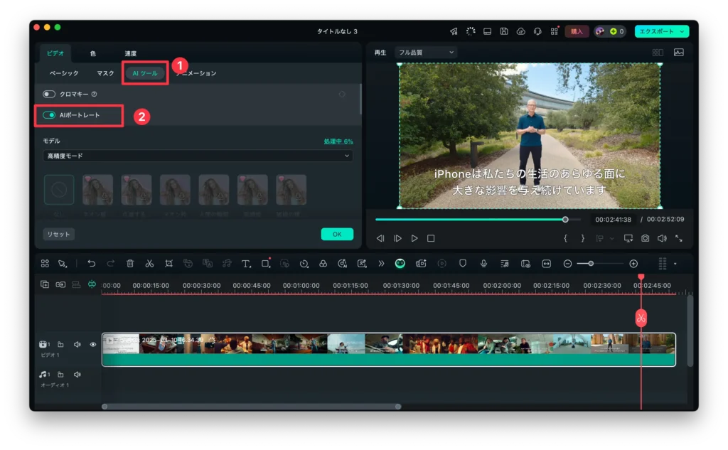 Filmoraでタイムラインの動画をダブルクリックし、AIツールタブでAIポートレートを選択すると、動画の背景が簡単に取り除かれます。