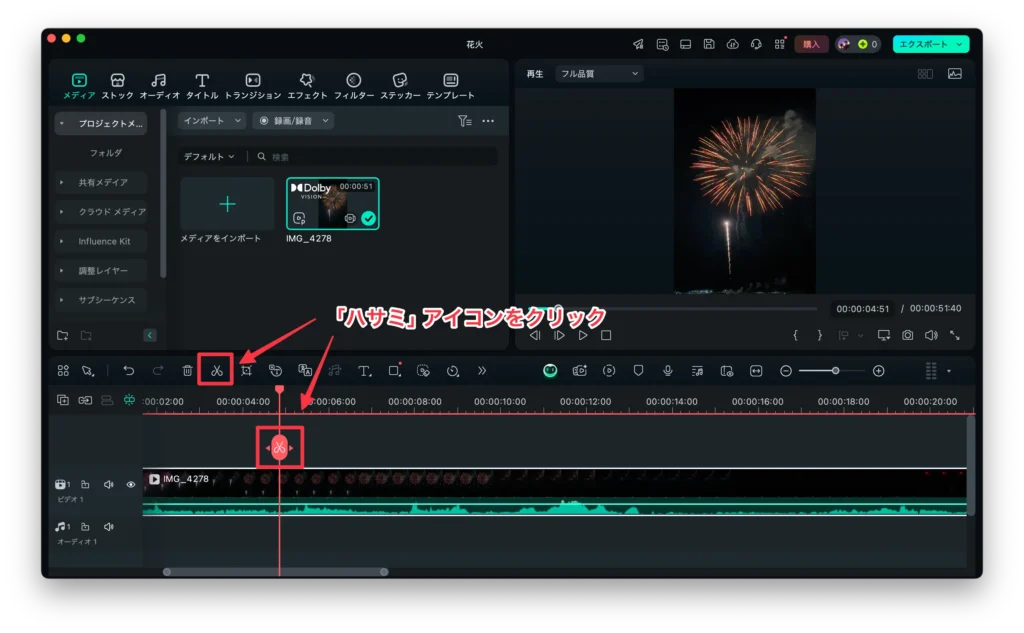 ステップ2. 動画の再生を開始し、トリミングしたい開始位置で停止します。タイムライン上の「ハサミ」アイコンをクリックして、動画を分割します。
