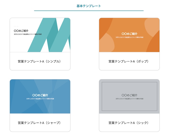 イルシルには無料のテンプレートもたくさん提供しております。提供営業テンプレートA(シャープ・シック・シンプル・ポップ)など、すべて無料でご利用いただけます。