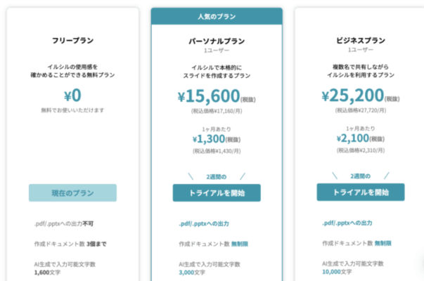 【最大30%OFF】のイルシルクーポンが受けられ、年間は最低1,300円/月で利用できます。ビジネスプランイルシル価格は2,100円/月で、個人プランと同じく2週間の無料試用期間があります。無料プランも利用できます。