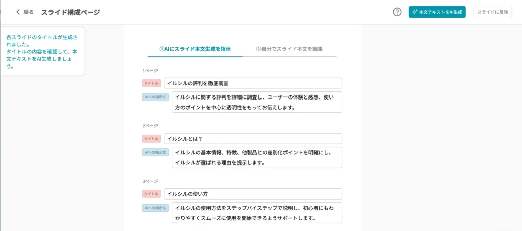 ステップ7. しばらくすると、「イルシル」が提供されたキーワードや資料を理解し、以下の資料が生成されます。ここでタイトルや指示文を編集することが可能です。編集が終わったら、右上の「スライドに反映」ボタンをクリックします。