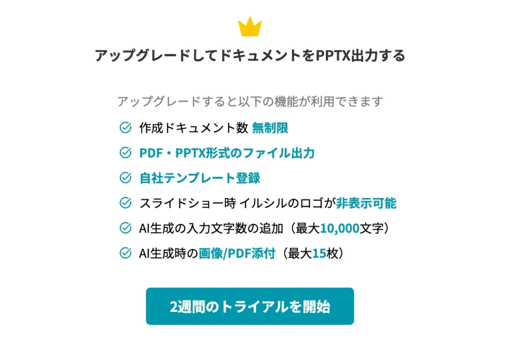 「イルシル」で無料で作成したスライドは出力できません。カード情報を入力して、2週間のトライアルを開始した後、出力できるしかありません。とても不便だと思います。
