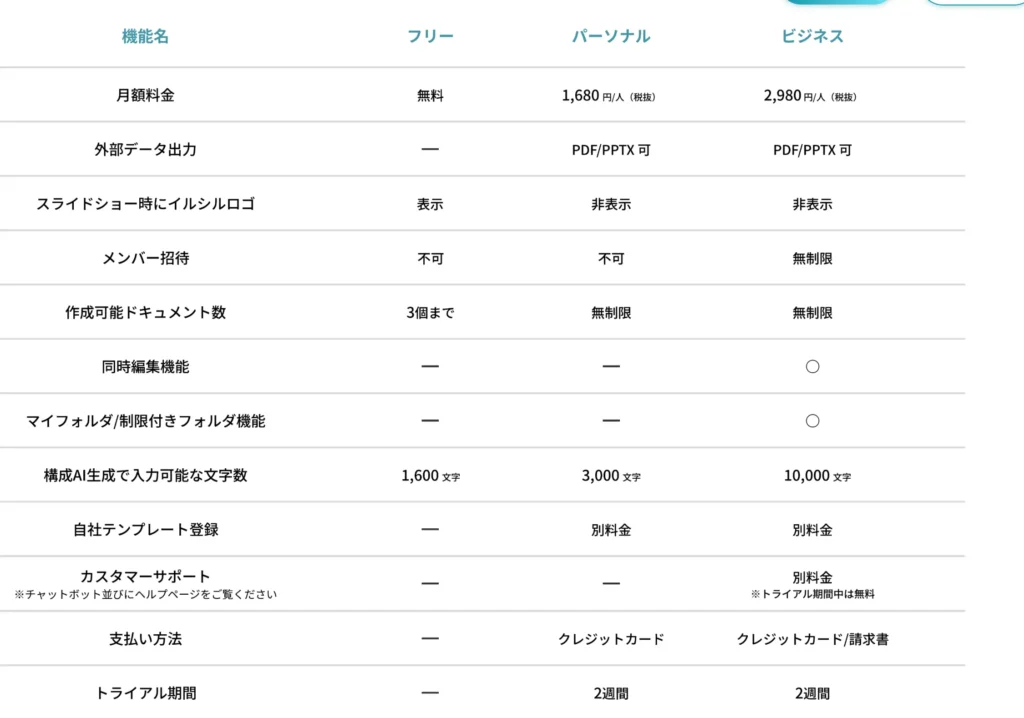 「イルシル」ではフリープラン、パーソナルプラン、ビジネスプランの3つのプランが用意されています。それぞれに機能や制限が異なります。詳しい情報は以下の通りです。