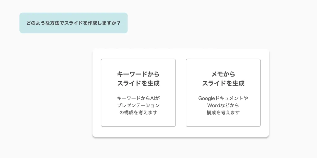 ステップ4. 次の画面では、「キーワードからスライドを生成」または「メモからスライドを生成」を選択します。自分は「キーワードからスライドを生成」を選択しました。