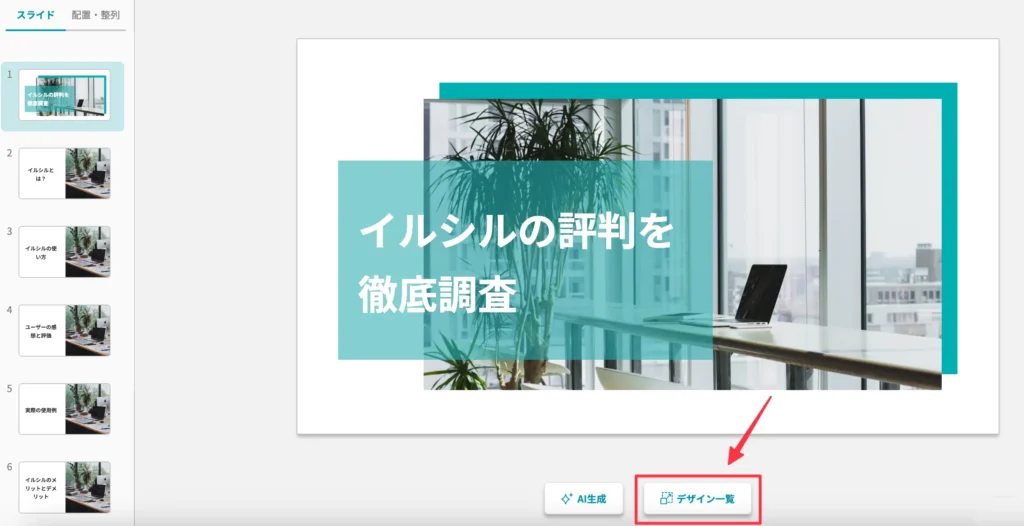 ステップ7. 以下は、筆者が「イルシル」を使って生成したスライドです。スライドをクリックすると、写真や文字、サイズ、色などを自由に編集することができます。