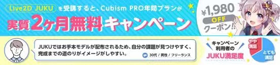 Live2d JUKUにつきましては、開設1周年を記念して、Live2D JUKU(月額990円)の受講生を対象に、Live2D Cubism PRO年間プラン1,980円(JUKU授業料の2ヶ月分相当)のクーポンの配布を開始いたします。 プロモーションは2022年9月1日に開始され、終了日は未定です。 Live2d CubismクーポンはCubism PRO 3年プランおよび年間プランの新規購入にのみ有効であり、定期課金には適用されません。