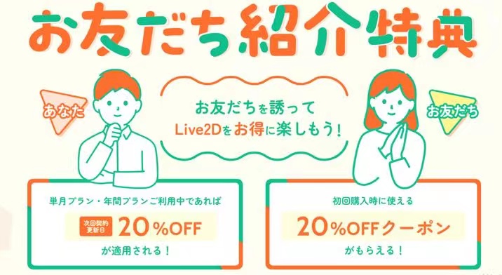 PRO版を購入していない友達がいる場合は、Live2D Storeにログインして、友達に20%割引のクーポンを発行することができます。 お友達がこのクーポンを使用して PRO 版を購入した場合、紹介者であるあなたは次回の更新日に20%割引クーポンを自動的に受け取ります。 Live2d クーポンコードをパブリックで共有できますが、使用できるのは 1 人だけです。