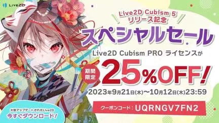Live2D Cubism 5では記念セールを開催し、2023年9月21日から2023年10月12日までの期間限定で「Live2D Cubism PRO」購入時に25%割引でご利用いただけるクーポンを発行いたします。 クーポンコードはUQRNGV7FN2で、対象製品はLive2D Cubism PRO Personal Edition、Business Editionの年間プランまたは3年プランです。