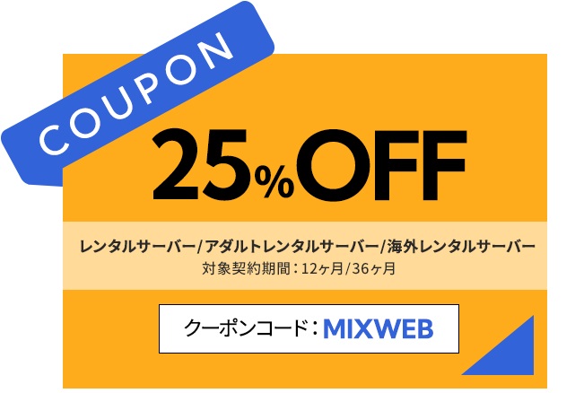 今ならレンタルサーバー、アダルトレンタルサーバー、海外レンタルサーバーを12ヶ月または36ヶ月契約すると25%割引クーポンがもらえます。 スムーズに割引を利用するには、支払い前にMIXWEBクーポンコードを入力する必要があります。