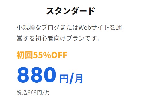 Mixhostが立ち上げたスタンダードプランを初めて購入すると、初月は55%割引の880円(通常価格:1,980円/月)のみとなります。 このプランを購入すると、無料のドメインとWordPress サポートが得られます。