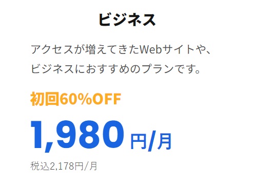 Mixhostは、トラフィックが増加する Web サイトまたはビジネスにはビジネスプランをお勧めします。 初めてビジネスプランを購入場合は、初期費用が60%割引され、1,980円/月(通常価格:4,980円/月)で購入できます。