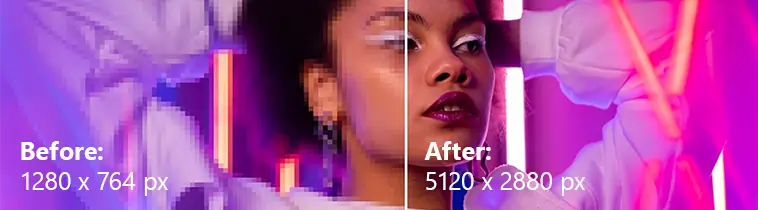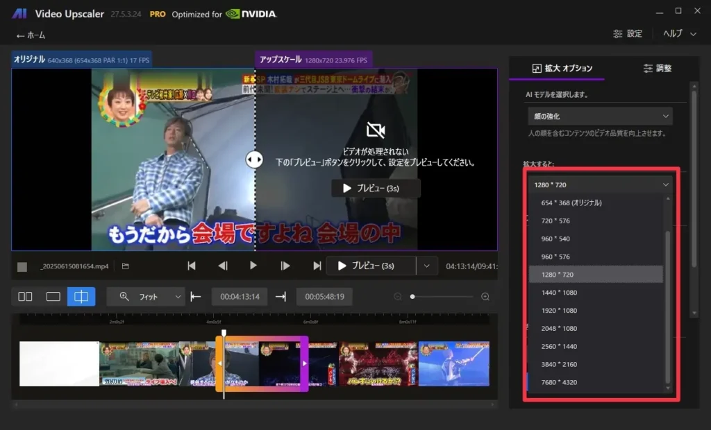 AI技術により、ワンクリックで最大4Kまでの超解像アップスケーリング、ノイズ除去、フレーム補間、顔の細部強調、色調調整などを実現することができます。
