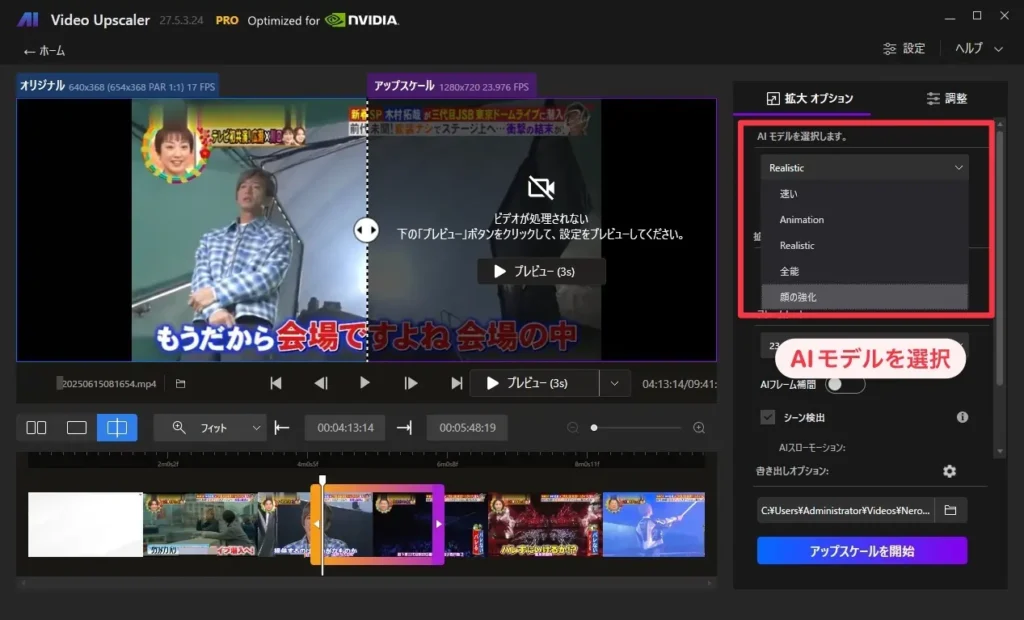 Nero AI Video Upscalerでは、速い、アニメーション、現実的、色調調整、顔強調と言った5つのAIモデを搭載しています。また、Nero AI Video Upscalerは動画の内容に合わせて、「速い」、「アニメーション」、「現実的」、「多用途」、「顔強調」5つのモデルから選ぶことができます。適切に選択することで、動画の特性も維持することができます。
