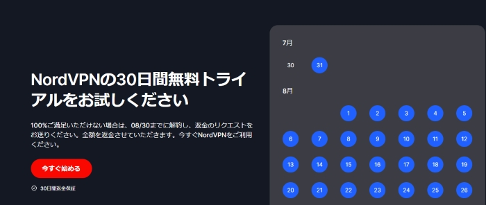 NordVPNは30日間の無料トライアルクーポンもあります。30日間で無料で利用できます。詳細な情報はこちらのページへご参考ください。