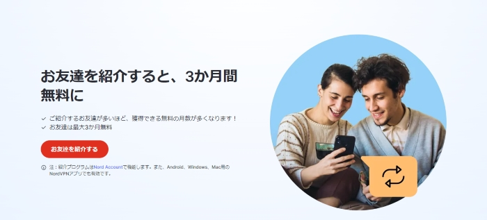 NordVPN公式には、お友達紹介特典もあります。もしお友達はあなたが紹介してくれたリンクから30日間の無料トライアルを利用する場合、最大3ヶ月の無料特典が取得できます。プランを購入するなら、さらに1ヶ月分の無料期間ももらえます。紹介していた友達が多いほど、もらえる無料時間も多いです。ぜひご利用ください。