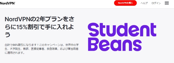 NordVPNとは世界中の学生、大学院生、教師、医療従事者、救急隊員、および軍当局者のために、学割を提供しております。2年プランをさらに15%の割引が追加可能です。つまり、合計66%の割引となります。上述の方はこんなやすい割引でNordVPNを購入したいなら、ぜひ次のボタンをクリックして購入してください。