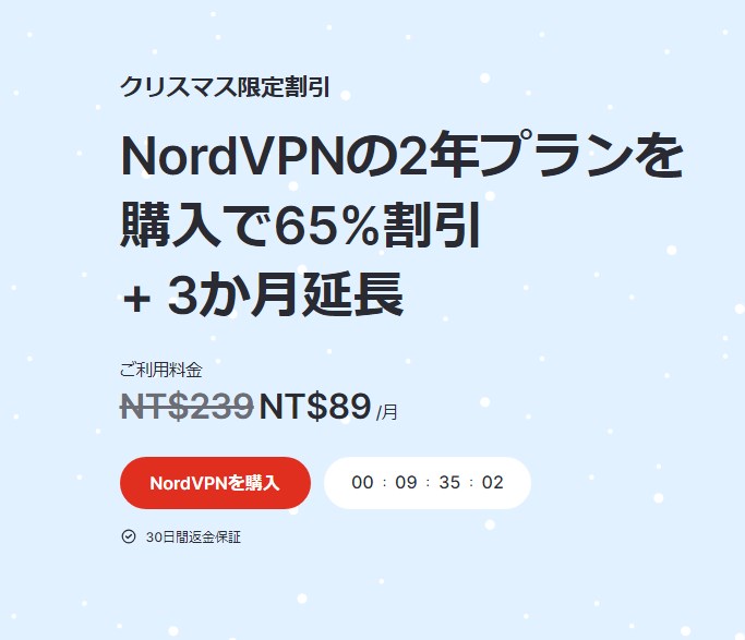 これは、クリスマスセール&年末年始セール期間中のNordVPN(ノードVPN)クーポン・クーポンコードです。随時更新ですので、ぜひこのページまでにご参考ください。