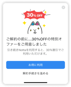 アプリ版のNottaを利用して、解約する際、30%オフの割引ポップアップがでてきます。